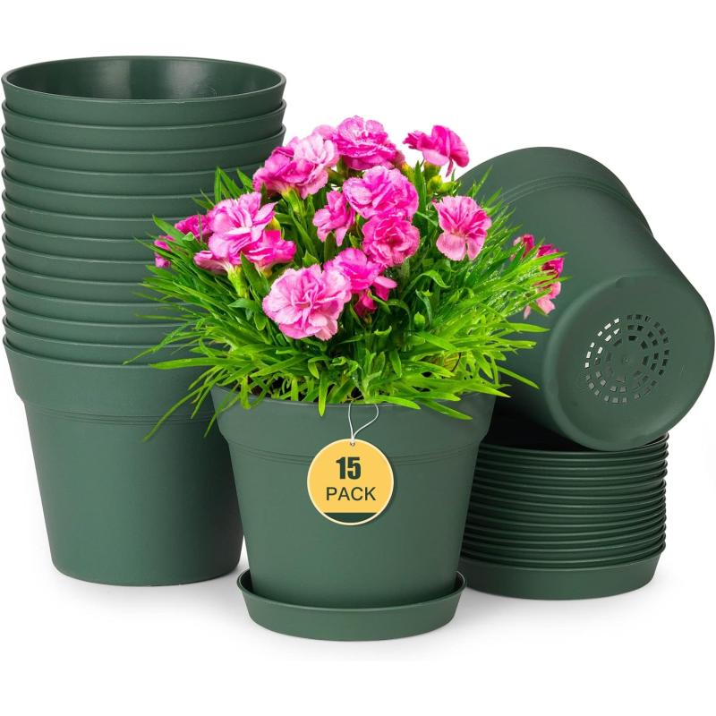 Homenote Pots for Plants, 8 Pcs 7.5 inch Plastic Planters with Multiple Drainage Holes and Tray – Plant Pots for All Home Garden Flowers Succulents, Matte Black(Green-15pcs)